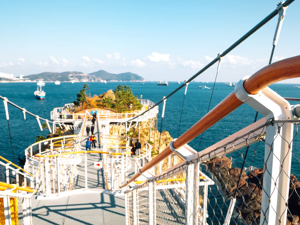 부산의 송도 용궁구름다리는 암남공원과 동섬이라는 작은 무인도를 연결해요. 다리는 길이가 127m이고 섬을 감싸고 돌아서 바다 위를 걷는 듯한 기분이 들죠.