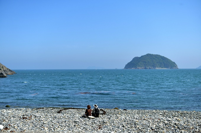 이곳의 몽돌은 경남 해안의 다른 몽돌 해수욕장보다 크고 투박한 것이 많아 걷기에 조금 불편할 수 있는데 깊은 만 때문에 파도가 세게 들이치지 못해 덜 다듬어졌기 때문인 듯해요. 해수욕장을 즐긴 후에는 연대도와 만지도를 연결하는 출렁다리에 가보세요. 다리를 따라 푸른 바다 위를 걸어 보면 98m라는 길이가 결코 짧지 않다는 생각이 들 거예요.